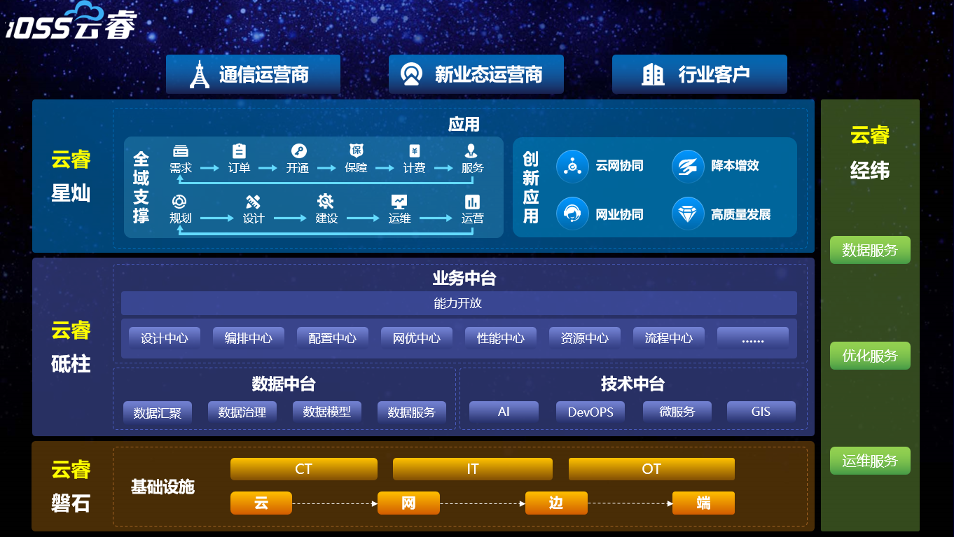 贝斯特全球奢华iOSS云睿4大方向:云睿磐石、云睿砥柱、云睿星灿、云睿经纬,包括但不限于数据中心基础设施管理(DCIM)系统解决方案,智慧中台解决方案,基础FCAPS能力(资产管理、故障管理、性能管理、优化管理)及质效运维、电子运维、代维管理、能耗管理、指挥调度、智能运维、成本管理、费用稽核等系统解决方案,家集客解决方案,新业务支撑(5G业务设计、编排、保障管理)解决方案,云网融合服务解决方案,能力开放解决方案,运维服务解决方案等等。
